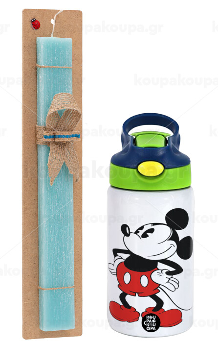 Mickey Classic, Easter Set, Children's thermal stainless steel bottle with safety straw, green/blue (350ml) & aromatic flat Easter candle (30cm) (TURQUOISE)
