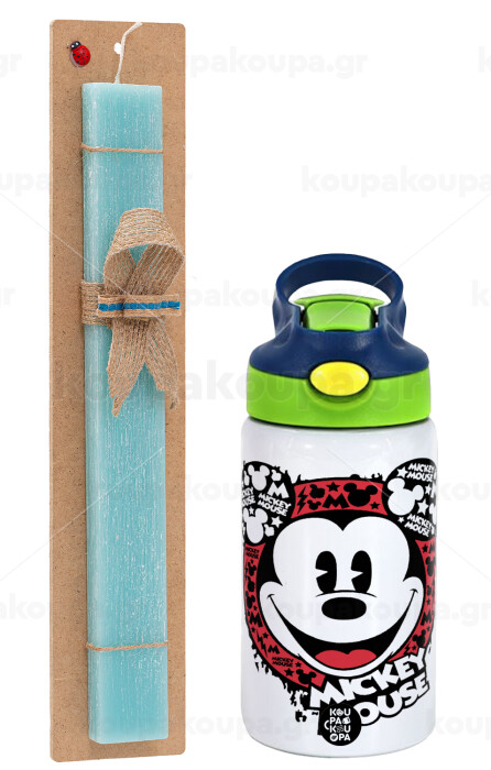 Mickey Mouse, Easter Set, Children's thermal stainless steel bottle with safety straw, green/blue (350ml) & aromatic flat Easter candle (30cm) (TURQUOISE)