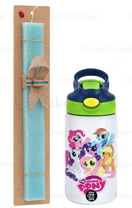 My Little Pony, Easter Set, Children's thermal stainless steel bottle with safety straw, green/blue (350ml) & aromatic flat Easter candle (30cm) (TURQUOISE)