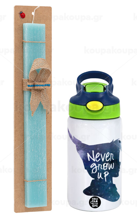 Never Grow UP, Easter Set, Children's thermal stainless steel bottle with safety straw, green/blue (350ml) & aromatic flat Easter candle (30cm) (TURQUOISE)