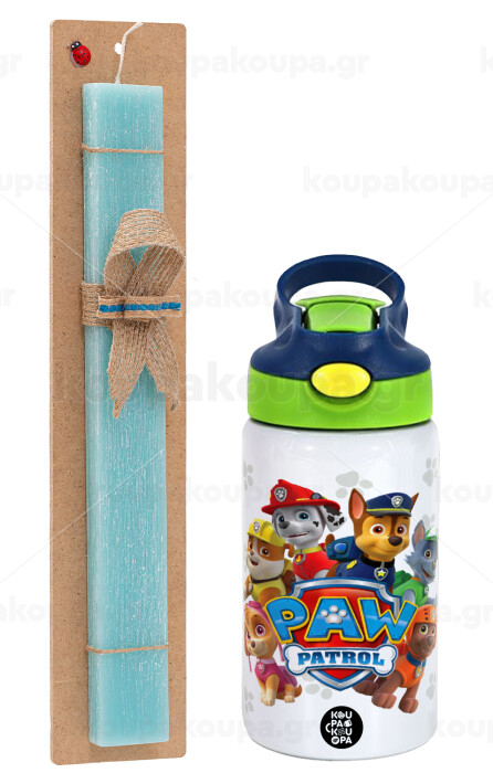 PAW patrol, Easter Set, Children's thermal stainless steel bottle with safety straw, green/blue (350ml) & aromatic flat Easter candle (30cm) (TURQUOISE)