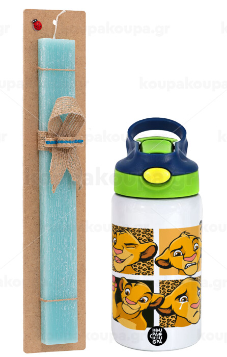Simba, lion king, Easter Set, Children's thermal stainless steel bottle with safety straw, green/blue (350ml) & aromatic flat Easter candle (30cm) (TURQUOISE)