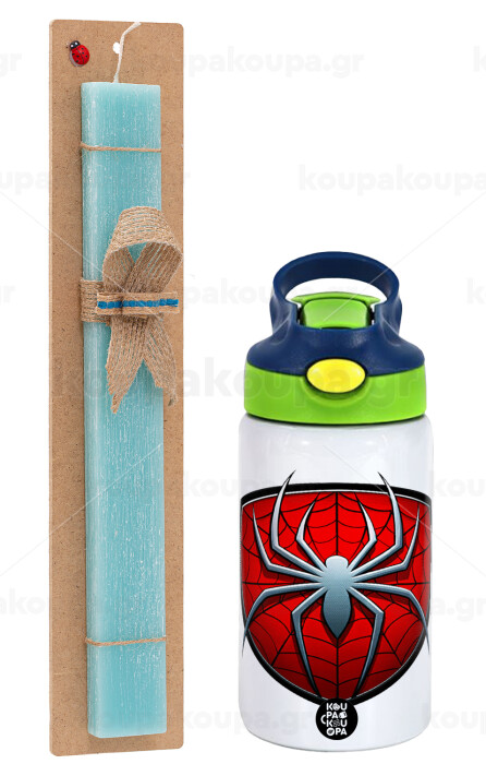 Spider-man, Easter Set, Children's thermal stainless steel bottle with safety straw, green/blue (350ml) & aromatic flat Easter candle (30cm) (TURQUOISE)