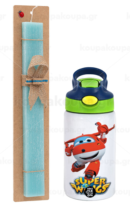 Super Wings, Easter Set, Children's thermal stainless steel bottle with safety straw, green/blue (350ml) & aromatic flat Easter candle (30cm) (TURQUOISE)