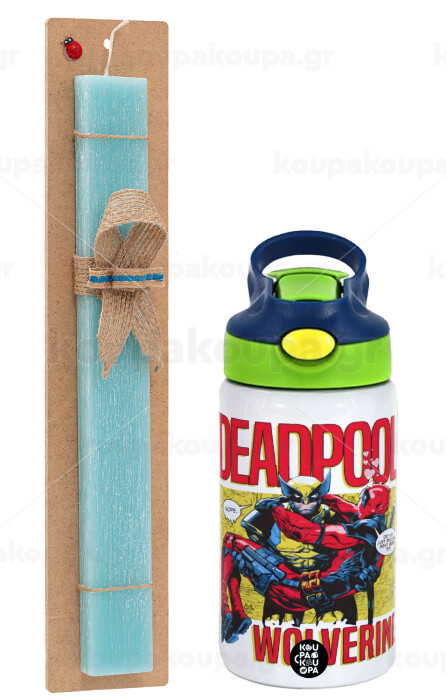 Superhero Deadpool Wolverine, Easter Set, Children's thermal stainless steel bottle with safety straw, green/blue (350ml) & aromatic flat Easter candle (30cm) (TURQUOISE)
