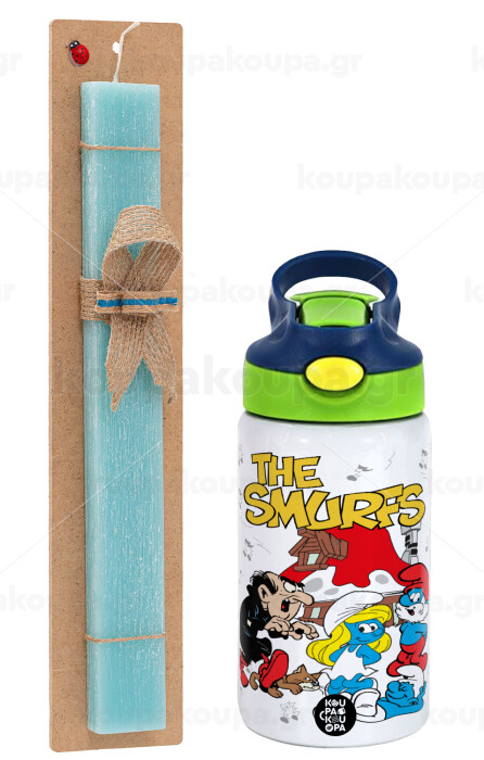 The smurfs, Easter Set, Children's thermal stainless steel bottle with safety straw, green/blue (350ml) & aromatic flat Easter candle (30cm) (TURQUOISE)