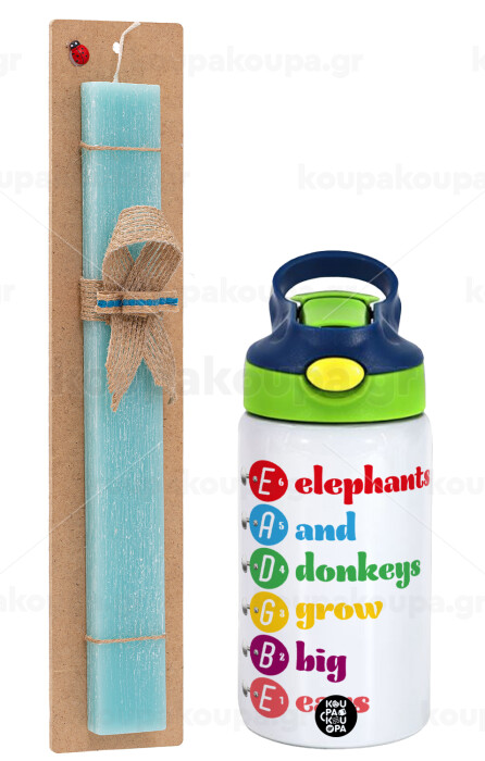 Elephants And Donkeys Grow Big Ears, Easter Set, Children's thermal stainless steel bottle with safety straw, green/blue (350ml) & aromatic flat Easter candle (30cm) (TURQUOISE)