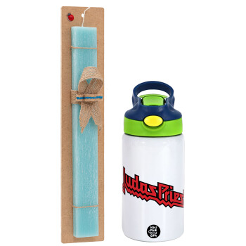 Judas Priest, Easter Set, Children's thermal stainless steel bottle with safety straw, green/blue (350ml) & aromatic flat Easter candle (30cm) (TURQUOISE)