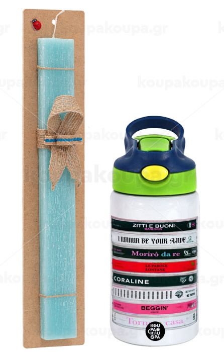 Maneskin Cassette, Easter Set, Children's thermal stainless steel bottle with safety straw, green/blue (350ml) & aromatic flat Easter candle (30cm) (TURQUOISE)