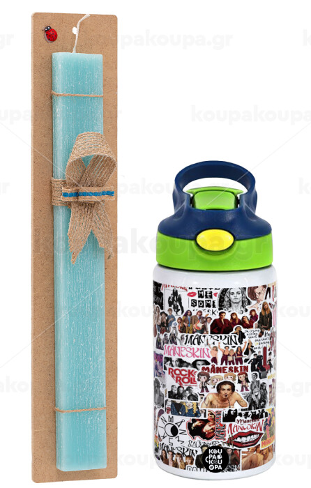 Maneskin stickers, Easter Set, Children's thermal stainless steel bottle with safety straw, green/blue (350ml) & aromatic flat Easter candle (30cm) (TURQUOISE)