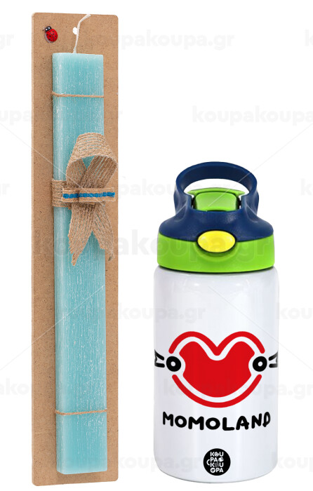 Momoland, Easter Set, Children's thermal stainless steel bottle with safety straw, green/blue (350ml) & aromatic flat Easter candle (30cm) (TURQUOISE)
