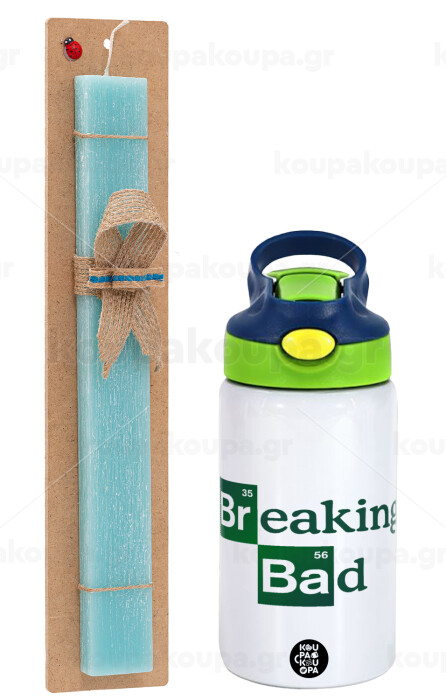 Breaking Bad, Easter Set, Children's thermal stainless steel bottle with safety straw, green/blue (350ml) & aromatic flat Easter candle (30cm) (TURQUOISE)