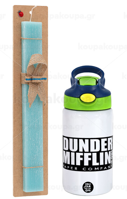 Dunder Mifflin, Inc Paper Company, Easter Set, Children's thermal stainless steel bottle with safety straw, green/blue (350ml) & aromatic flat Easter candle (30cm) (TURQUOISE)