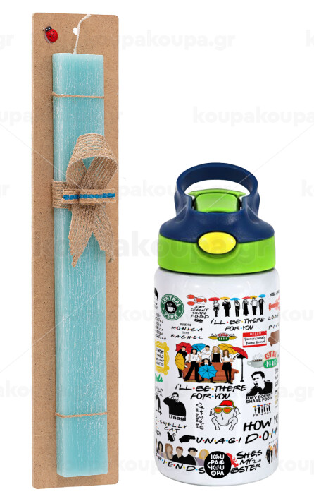 Friends, Easter Set, Children's thermal stainless steel bottle with safety straw, green/blue (350ml) & aromatic flat Easter candle (30cm) (TURQUOISE)