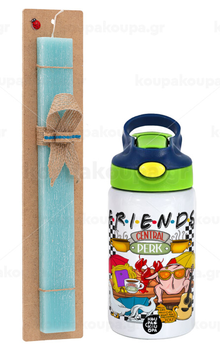 Friends, Easter Set, Children's thermal stainless steel bottle with safety straw, green/blue (350ml) & aromatic flat Easter candle (30cm) (TURQUOISE)