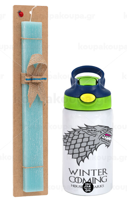 GOT House of Starks, winter coming, Easter Set, Children's thermal stainless steel bottle with safety straw, green/blue (350ml) & aromatic flat Easter candle (30cm) (TURQUOISE)