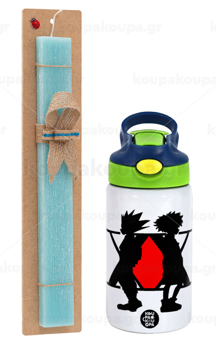 hunter x hunter, Easter Set, Children's thermal stainless steel bottle with safety straw, green/blue (350ml) & aromatic flat Easter candle (30cm) (TURQUOISE)