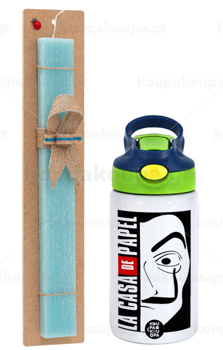 La casa de papel vertical, Easter Set, Children's thermal stainless steel bottle with safety straw, green/blue (350ml) & aromatic flat Easter candle (30cm) (TURQUOISE)