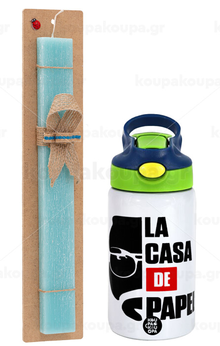 La casa de papel, Easter Set, Children's thermal stainless steel bottle with safety straw, green/blue (350ml) & aromatic flat Easter candle (30cm) (TURQUOISE)