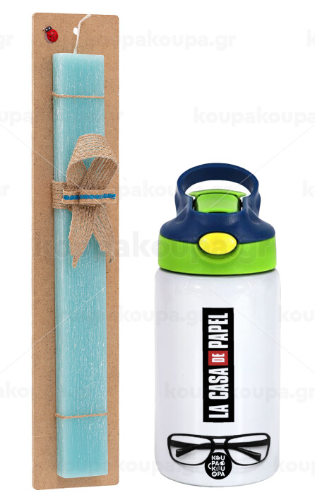 la professor, γυαλιά, Easter Set, Children's thermal stainless steel bottle with safety straw, green/blue (350ml) & aromatic flat Easter candle (30cm) (TURQUOISE)