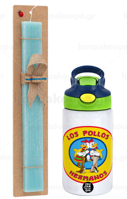 Los Pollos Hermanos, Easter Set, Children's thermal stainless steel bottle with safety straw, green/blue (350ml) & aromatic flat Easter candle (30cm) (TURQUOISE)