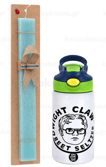 The office Dwight Claw (beet seltzer), Easter Set, Children's thermal stainless steel bottle with safety straw, green/blue (350ml) & aromatic flat Easter candle (30cm) (TURQUOISE)