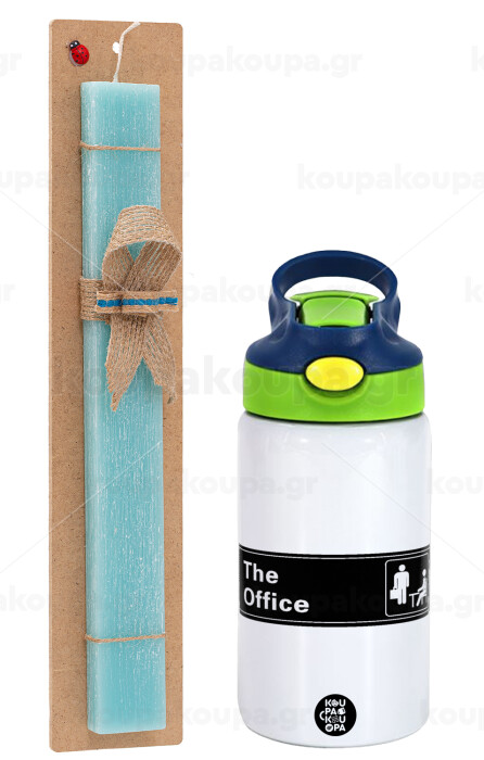 The office, Easter Set, Children's thermal stainless steel bottle with safety straw, green/blue (350ml) & aromatic flat Easter candle (30cm) (TURQUOISE)