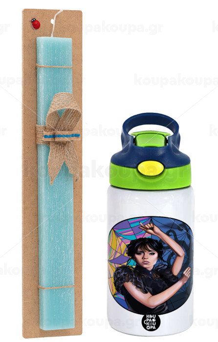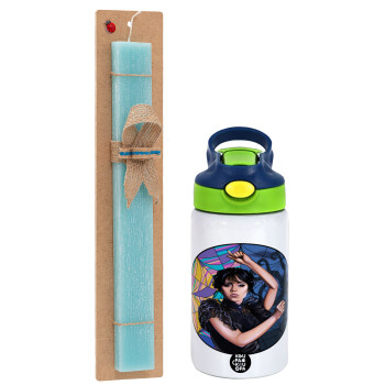 Wednesday dance, Easter Set, Children's thermal stainless steel bottle with safety straw, green/blue (350ml) & aromatic flat Easter candle (30cm) (TURQUOISE)