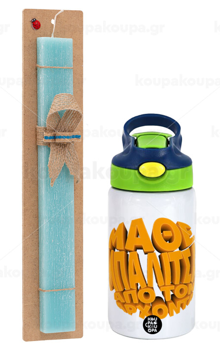 Μάθε μπαλίτσα από τον Άρχοντα, Easter Set, Children's thermal stainless steel bottle with safety straw, green/blue (350ml) & aromatic flat Easter candle (30cm) (TURQUOISE)