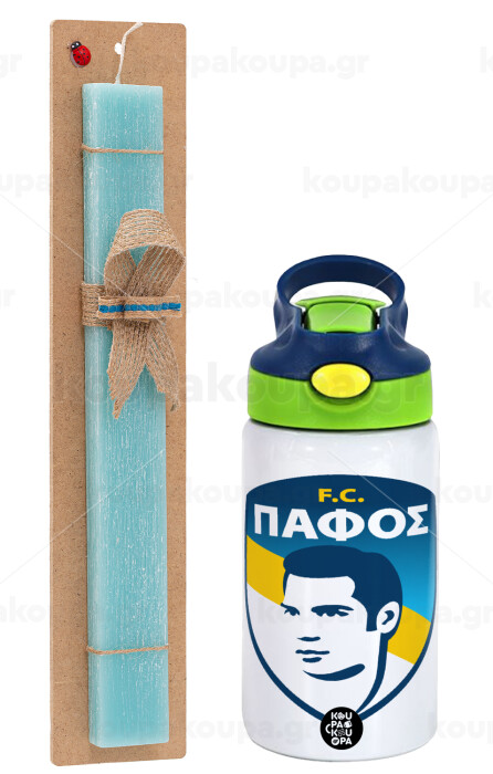 Πάφος FC, Easter Set, Children's thermal stainless steel bottle with safety straw, green/blue (350ml) & aromatic flat Easter candle (30cm) (TURQUOISE)