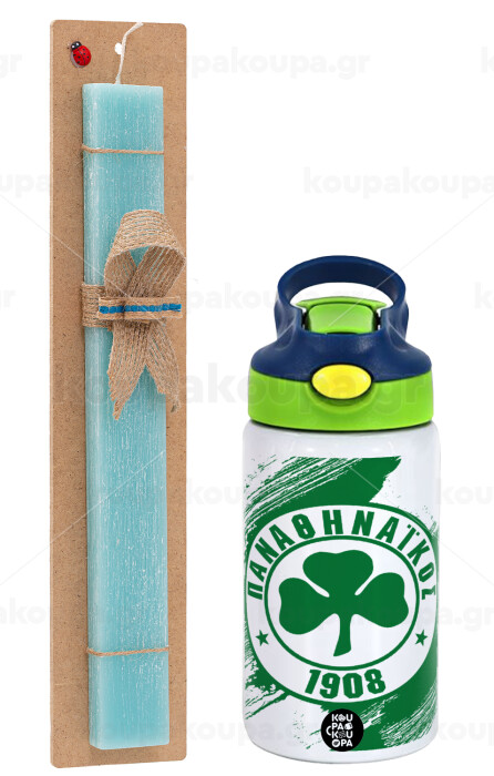 Π.Α.Ο., Easter Set, Children's thermal stainless steel bottle with safety straw, green/blue (350ml) & aromatic flat Easter candle (30cm) (TURQUOISE)