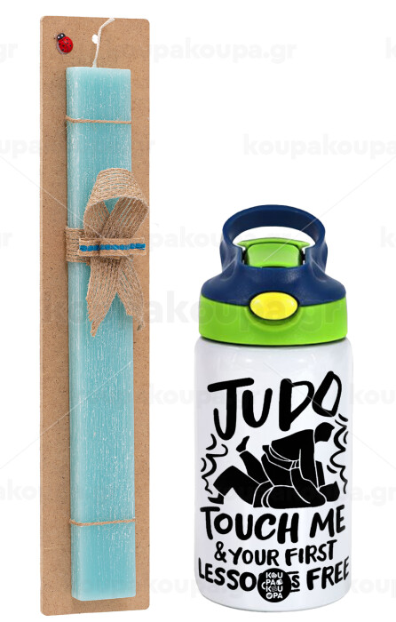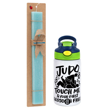 Judo Touch Me And Your First Lesson Is Free, Easter Set, Children's thermal stainless steel bottle with safety straw, green/blue (350ml) & aromatic flat Easter candle (30cm) (TURQUOISE)
