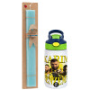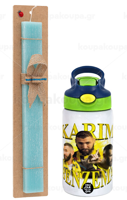 Karim Benzema, Easter Set, Children's thermal stainless steel bottle with safety straw, green/blue (350ml) & aromatic flat Easter candle (30cm) (TURQUOISE)