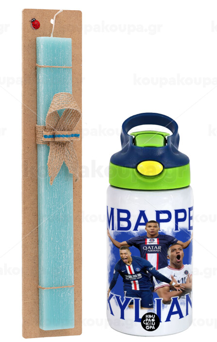 Kylian Mbappé, Easter Set, Children's thermal stainless steel bottle with safety straw, green/blue (350ml) & aromatic flat Easter candle (30cm) (TURQUOISE)