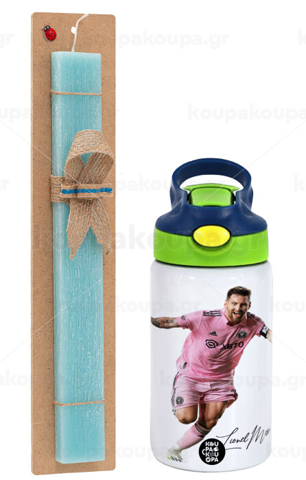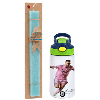Lionel Messi inter miami jersey, Easter Set, Children's thermal stainless steel bottle with safety straw, green/blue (350ml) & aromatic flat Easter candle (30cm) (TURQUOISE)