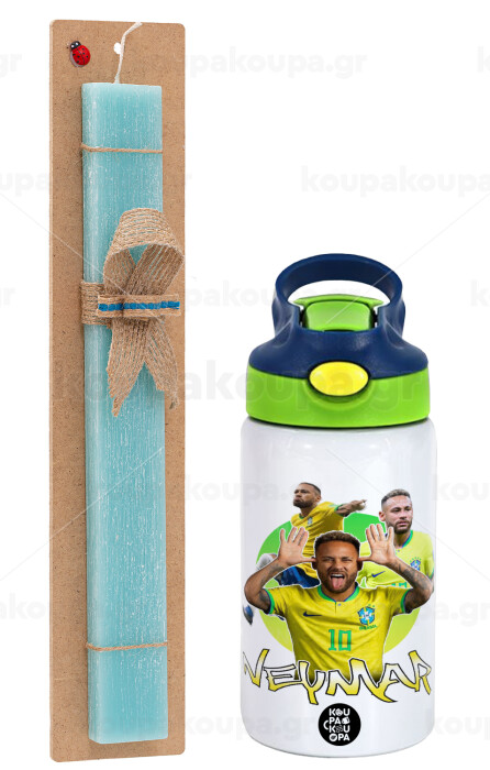 Neymar JR, Easter Set, Children's thermal stainless steel bottle with safety straw, green/blue (350ml) & aromatic flat Easter candle (30cm) (TURQUOISE)