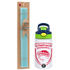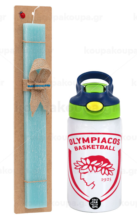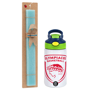Olympiacos B.C., Easter Set, Children's thermal stainless steel bottle with safety straw, green/blue (350ml) & aromatic flat Easter candle (30cm) (TURQUOISE)