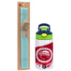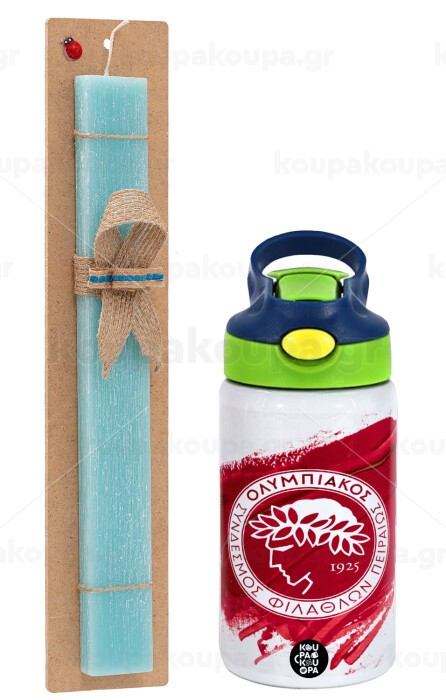 Olympiacos F.C., Easter Set, Children's thermal stainless steel bottle with safety straw, green/blue (350ml) & aromatic flat Easter candle (30cm) (TURQUOISE)