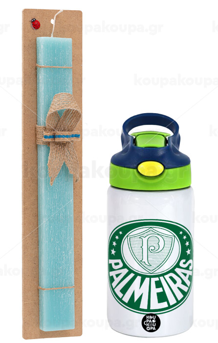 Palmeiras, Easter Set, Children's thermal stainless steel bottle with safety straw, green/blue (350ml) & aromatic flat Easter candle (30cm) (TURQUOISE)
