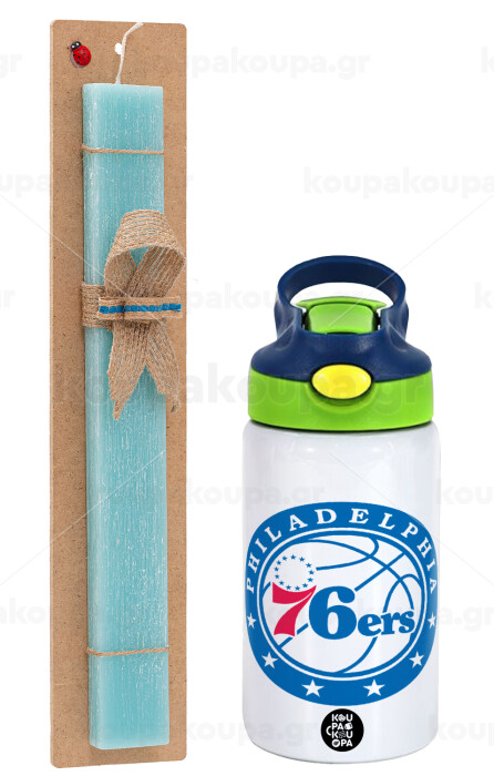 Philadelphia 76ers, Easter Set, Children's thermal stainless steel bottle with safety straw, green/blue (350ml) & aromatic flat Easter candle (30cm) (TURQUOISE)