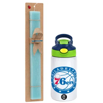 Philadelphia 76ers, Easter Set, Children's thermal stainless steel bottle with safety straw, green/blue (350ml) & aromatic flat Easter candle (30cm) (TURQUOISE)