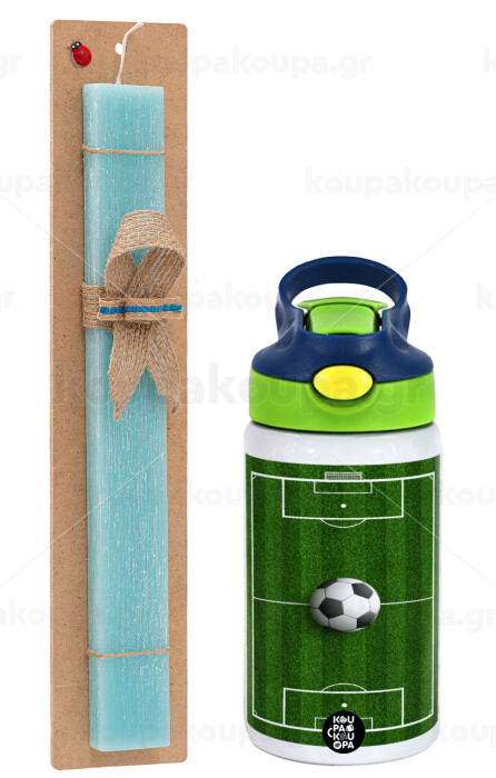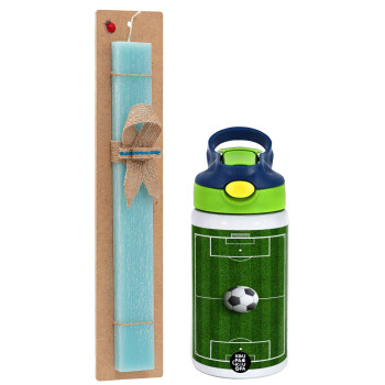 Soccer field, Γήπεδο ποδοσφαίρου, Easter Set, Children's thermal stainless steel bottle with safety straw, green/blue (350ml) & aromatic flat Easter candle (30cm) (TURQUOISE)