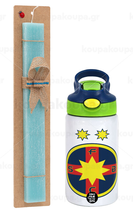 FC Steaua Bucuresti (FCSB), Easter Set, Children's thermal stainless steel bottle with safety straw, green/blue (350ml) & aromatic flat Easter candle (30cm) (TURQUOISE)