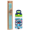 Stitch Touch Me And I Will Bite You, Easter Set, Children's thermal stainless steel bottle with safety straw, green/blue (350ml) & aromatic flat Easter candle (30cm) (TURQUOISE)