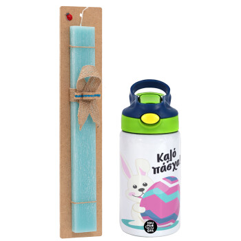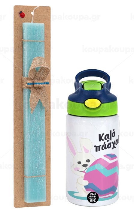 Καλό πάσχα, Easter Set, Children's thermal stainless steel bottle with safety straw, green/blue (350ml) & aromatic flat Easter candle (30cm) (TURQUOISE)