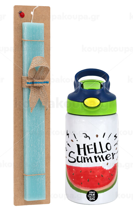 Summer Watermelon, Easter Set, Children's thermal stainless steel bottle with safety straw, green/blue (350ml) & aromatic flat Easter candle (30cm) (TURQUOISE)