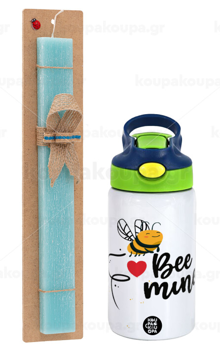 Bee mine!!!, Easter Set, Children's thermal stainless steel bottle with safety straw, green/blue (350ml) & aromatic flat Easter candle (30cm) (TURQUOISE)