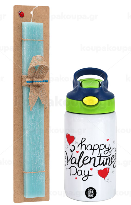 Happy Valentines Day!!!, Easter Set, Children's thermal stainless steel bottle with safety straw, green/blue (350ml) & aromatic flat Easter candle (30cm) (TURQUOISE)