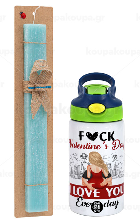 I love You Everyday , Easter Set, Children's thermal stainless steel bottle with safety straw, green/blue (350ml) & aromatic flat Easter candle (30cm) (TURQUOISE)
