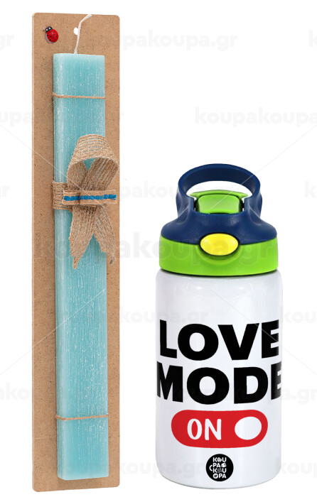 LOVE MODE ON, Easter Set, Children's thermal stainless steel bottle with safety straw, green/blue (350ml) & aromatic flat Easter candle (30cm) (TURQUOISE)